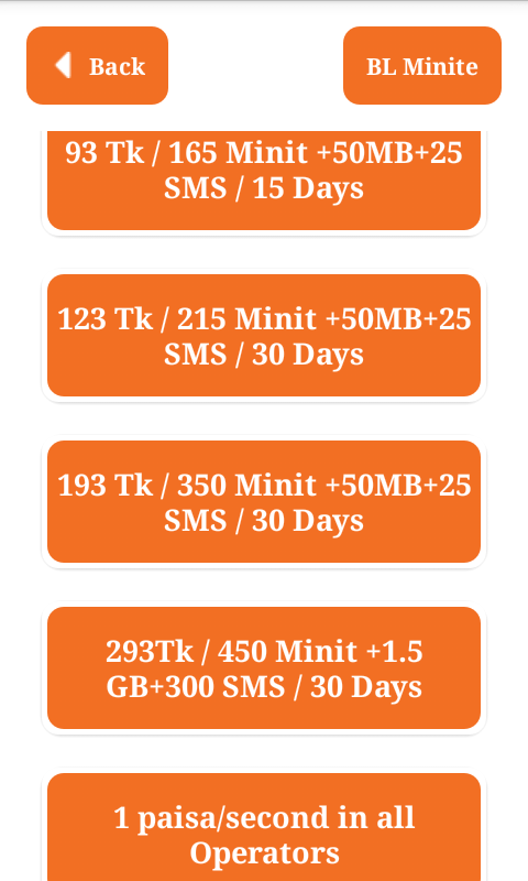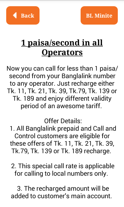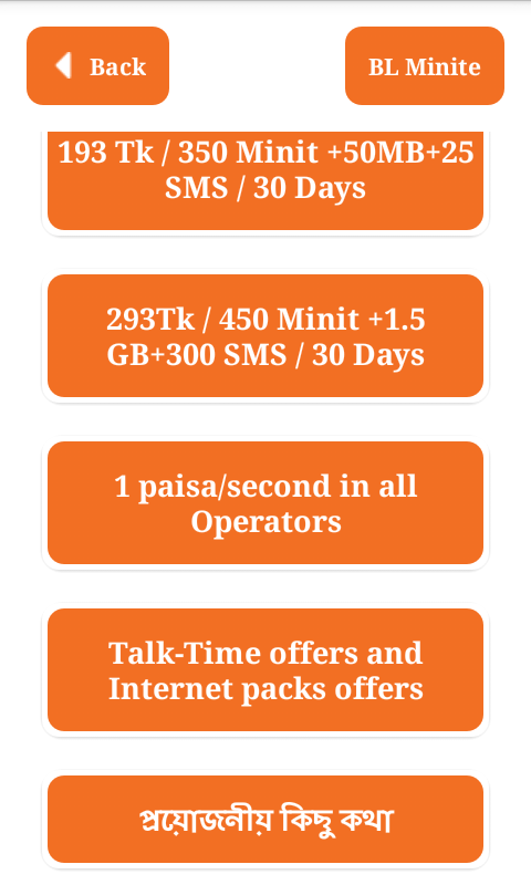 ” Minite offer banglalink-বাংলালিংক মিনিট প্যাক” আমাদের এ এ্যাপস টিতে বাংলালিংক সিমের সকল নতুন আপডেট বিভিন্ন মিনিট প্যাকেজ এর তথ্য দিয়ে সাজানো হয়েছে। আপনাদের আর কষ্ট করে দোকানদার দের বলতে হবে না শুধু মাত্র আমাদের এ এ্যাপস আপনার মোবাইল এ থাকলে আপনি নিজে নিজেই বিভিন্ন ইন্টারনেট প্যাকেজ নিতে পারবেন অতি সহজেই । যেভাবে ইন্টারনেট নিবেন , প্র্রথমে কোন প্যাকেজ টি নিবেন তা দেখুন, এবং সে প্যাকেজ টির activation code Dial এর উপর চেপে ধরে কোডটি সিলেট করে তা Copy করে ,আপনার মোবাইলের Keypad এ তা Paste করুন । তাহলে নির্দিষ্ট পরিমান ইন্টারনেট প্যাকেজ টি পেয়ে যাবেন ।