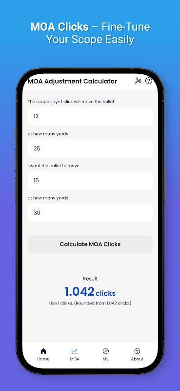 사용하기 쉬운 MOA 및 MIL 계산기를 사용하여 범위 조정에서 추측을 배제하세요. 장거리 정밀도를 위해 소총을 조정하든 현장에서 빠르게 조정하든 이 앱은 선택한 거리를 기준으로 MOA(분 각도) 및 MIL(밀리라디안) 조정에 대한 정확한 계산을 제공합니다.