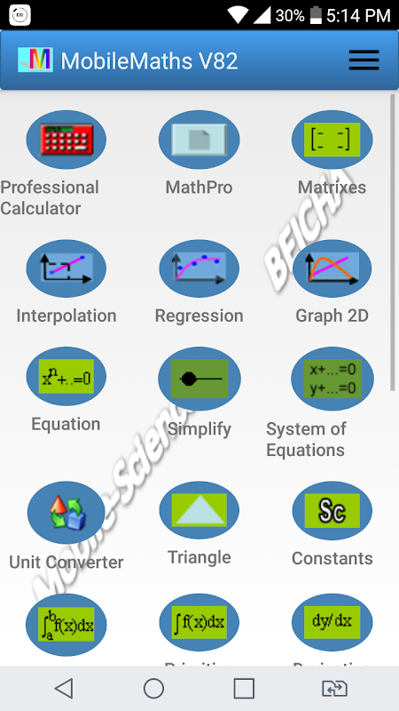 MobileMaths Lite is a set of mathematical and chemical applications for Mobile Phones and Tablets. MobileMaths program includes a lot of applications with a large of features. It is designed in order to fulfil the needs of every one(student, engineer, researcher... .). By using MobileMaths you can make your handset as home computer and will get substantially all of the computing capabilities desired by a large fraction of the public. All the calculations made by MobileMaths are accurate. MobileMaths includes the following powerful and improved tools: