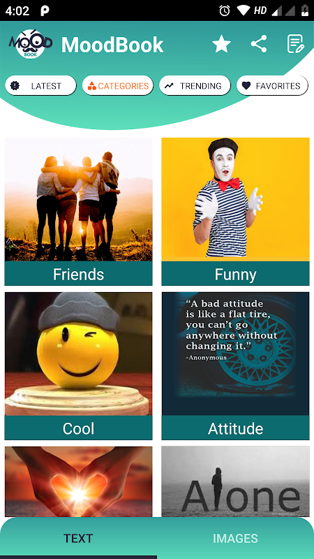 우리는 모든 소셜 네트워킹 계정에 대한 가장 인기있는 상태, 프로필 사진, 시세를 제공합니다. 이미지와 텍스트를 범주별로 구분하여 이미지와 텍스트를 빠르게 찾을 수 있습니다. 앱 자체에서 이미지 및 텍스트를 친구 및 가족과 공유 할 수 있습니다.