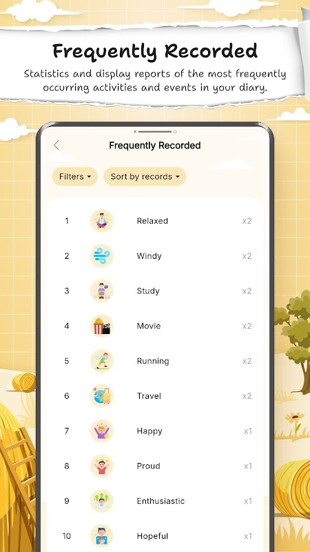 Keep track of your emotional ups and downs effortlessly. Record your feelings, daily activities, and events with simple steps, helping you build a full picture of your days and better understand your emotional well-being over time.
