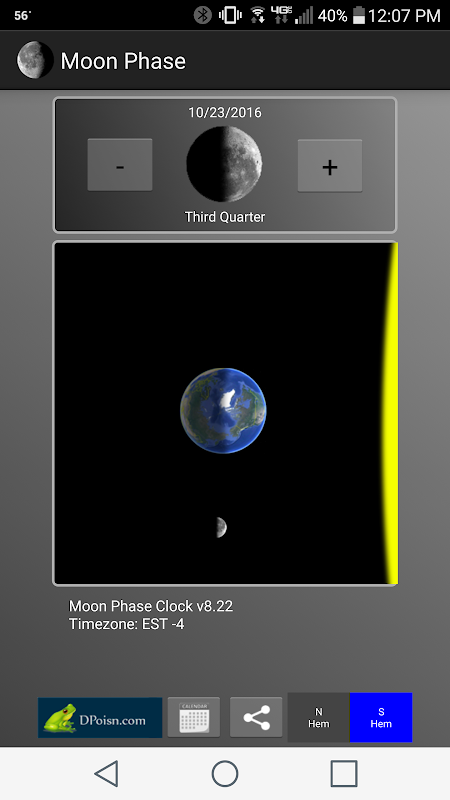 정보 화면의 위젯을 클릭합니다. 이것은 당신이 일을 스크롤 할 수 있고, 지구와 관련하여 달의 그래픽을 보여줍니다. 그것은 임의의 주어진 시간에 달하는 것처럼 보이는 이유 나은 표현을 제공한다. 지구의 회전은 한 시간 이내로 정확하다.