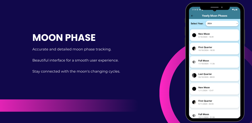 이 간단하고 직관적인 앱으로 달의 위상을 알아보세요. 현재 달의 위상에 대한 실시간 정보를 얻고 연간 달의 위상 달력을 살펴보세요. 모든 달 애호가를 위해 설계된 이 앱은 정확한 최신 정보를 제공합니다. 세련된 인터페이스와 원활한 탐색을 통해 달의 주기를 쉽게 추적할 수 있습니다. 이벤트를 계획 중이거나 단지 달의 위상이 궁금하다면 이 앱은 완벽한 도구입니다. 달과 연결을 유지하고 원활한 경험을 즐겨보세요!