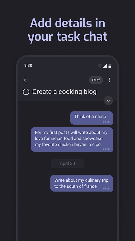 작업 관리가 문자 메시지처럼 자연스럽게 느껴지는 MoreStuff에 오신 것을 환영합니다. 채팅 기반 접근 방식을 사용하면 귀하의 작업이 대화형 연락처가 되어 친구와 문자 메시지를 보내는 것처럼 작업 관리가 쉽고 매력적이게 됩니다.