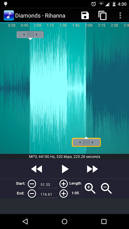 Ringpod는 음악 파일이나 녹음 파일에서 바로 벨소리를 만들 수 있습니다. 시작점과 종료점을 화살표로 조절하거나 시작, 종료버튼을 사용해서, 혹은 직접 입력하여 지정할 수 있습니다.