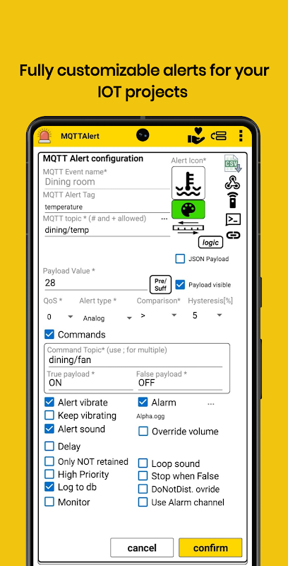 MQTTAlert는 IoT 기기를 모니터링하고 특정 조건(예: 문 열림, 온도 제한 초과, 습도 과다) 충족 시 즉시 휴대폰 알림 또는 알람을 발생시키도록 설계된 가볍고 강력한 MQTT 클라이언트입니다.
