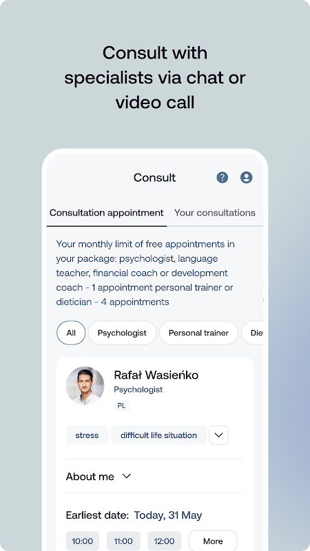 - 심리학자, 영양사, 퍼스널 트레이너, 개발 코치 등 수백 명의 전문가와 소통하세요.