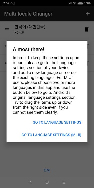 그러나 일부 제조업체는 Xiaomi (MIUI 10) 및 Oppo (ColorOS 5)와 같은 장치에서이 기능을 구현하지 않았습니다. 이 앱을 사용하면 같은 기기 사용자가 둘 이상의 언어를 선택할 수 있습니다. 또한 다른 언어 변경 응용 프로그램과 마찬가지로 사용자가 지원되지 않는 언어를 추가 할 수 있습니다.