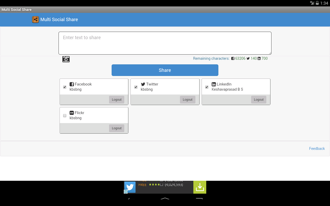 이 응용 프로그램은 한 번의 클릭으로 페이스 북, 트위터, 링크드 인, 플리커 (Flickr) 같은 다양한 소셜 네트워크에 동시에 동일한 게시물을 공유 할 수 있습니다. 그것은 당신이 텍스트와 이미지를 모두 공유 할 수 있습니다.