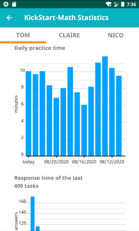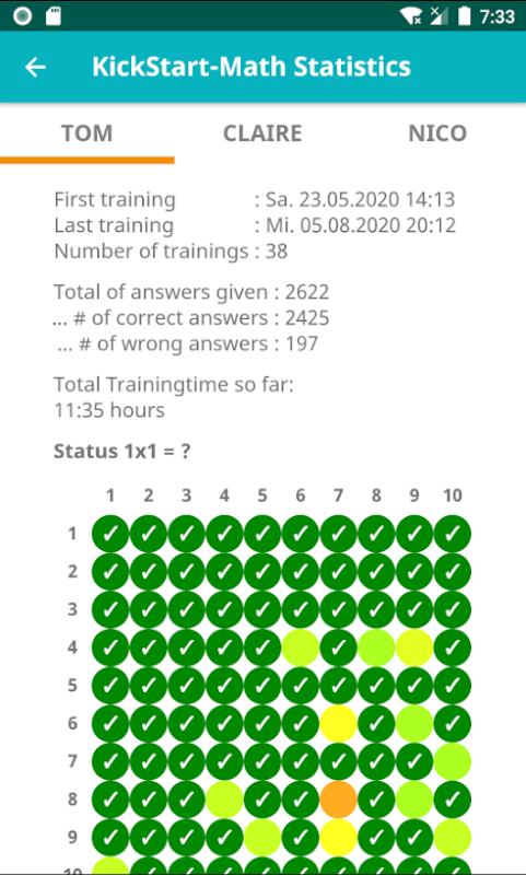 Outstanding fast mental math skills are quickly recognized so that the 100% learning goal will be achieved in less than 20 minutes. All other users will get their mental arithmetic up to speed supported by the app and with constant progress.