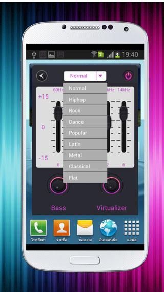 음악 EQ는베이스 부스트와로 Virtualizer 효과 다섯 밴드 이퀄라이저와 볼륨 슬라이더입니다.