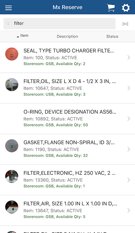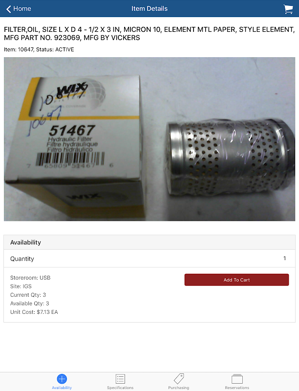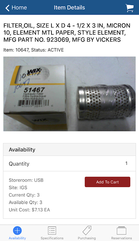 That’s where MxReserve comes in. Users can access the organization's full item catalog and perform intelligent searches, including bar code or QR code scanning, to find the part they need. They can see availability information, cost, outstanding purchasing and reservation information, as well as an image of the item. From there, they can add items to their shopping cart and checkout to create Material Requisitions. They can also see their past orders, and reorder items based upon that history.