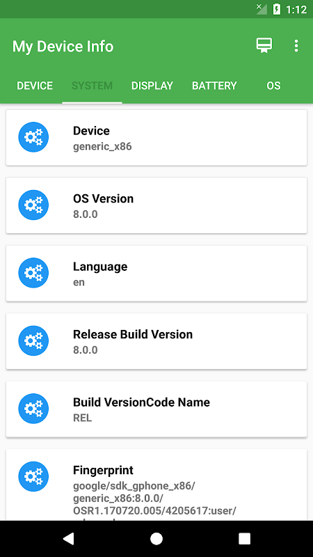 ★ System: Device, OS Version, Language, Release Build Version, Build Version Code Name, Fingerprint, Hardware, Board, Radio Version, Display Version, Build Brand, Build Host, Build Time, Build User, SDK Version, Build Serial.
