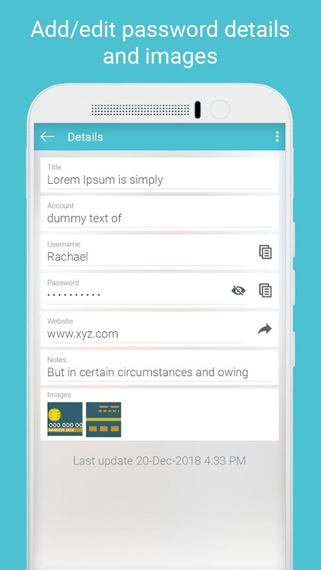 - Safely store documents, credit and debit card information (Save with images also supported)