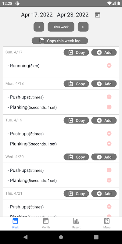 - 일일 훈련을 기록합니다. 등록된 메뉴를 선택하는 방법과 텍스트를 입력하는 방법이 있습니다.