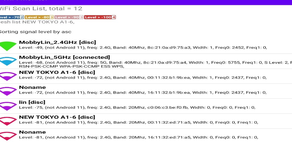 원하는대로 표준, 주파수, 대역 및 신호 레벨 데이터로 모든 Wi-Fi 데이터를 필터링하십시오.