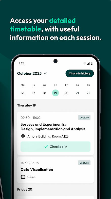 My Day를 사용하면 사용자 친화적인 형식으로 개인 학업 시간표를 볼 수 있습니다. 수업 시간, 장소, 기간에 대한 실시간 정보를 얻으세요. 길 찾기 도구를 사용하여 캠퍼스를 탐색하고 출석이 필요한 세션에 체크인하세요.
