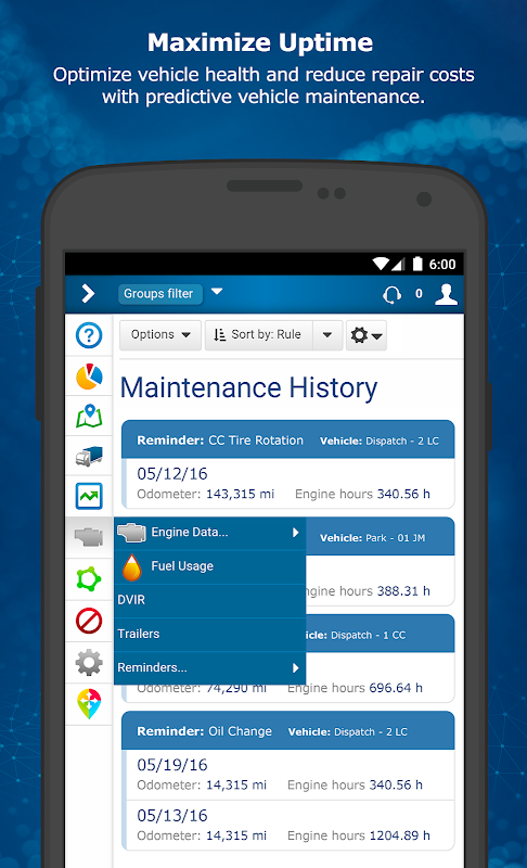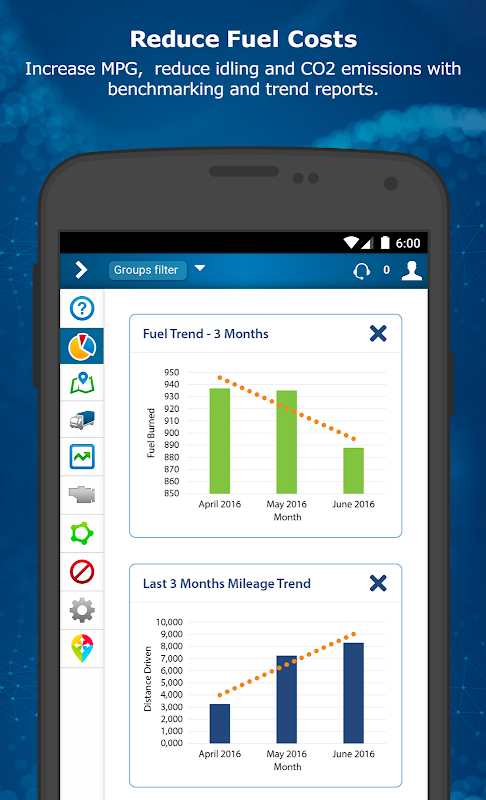 대시 보드 보고서는 공회전 연료 소비 동향을 시각화하기 쉬운, 그리고 더 많은합니다. 경로를 최적화하고 사전에 차량 유지 보수를 관리 할 수 있습니다. 서비스 (HOS), DVIR 및 드라이버 ID의 시간을 준수 그대로. MyGeotab 당신은, 연료 비용을 절감 가동 시간을 극대화하고, 차량 안전을 개선하는 데 도움이됩니다.