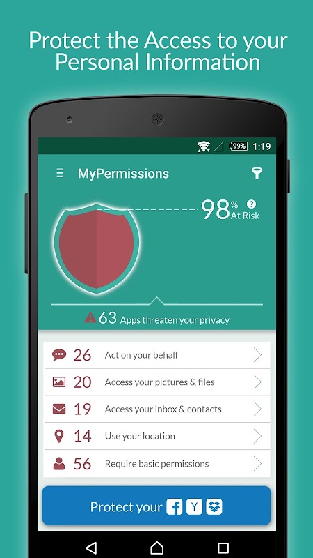 MyPermissions을 사용하면 자신의 개인 정보를 지능적으로 관리 할 수 있습니다! 부지불식간에 중에, 사진이나 문서, 위치 정보, 연락처, 이메일, 기타 기밀 정보가 공유되어 버리는 것을 방지한다.