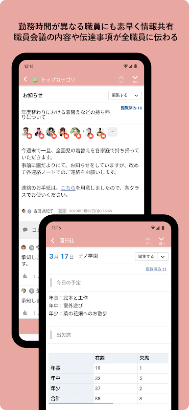 등록된 게시판(커뮤니티)이나 일지를 통해 모든 직원이 원내 상황(직원회의 내용, 전달사항, 각 클래스의 상황 등)을 신속하게 파악할 수 있습니다. 모든 직원에게 실시간으로 동일한 정보를 공유할 수 있어 시프트 근무로 직접 얼굴을 맞출 수 없거나 회의나 연수에 나오지 못함으로써 발생하는 정보 격차를 없앨 수 있습니다. 회의록이나 일지 등, 직원실내에서 관리되고 있는 정보를 디지털화하는 것으로, 필기 기록에 걸리는 시간의 삭감이 되는 것 외에, 디지털화에 의해 검색이 가능하게 되어, 과거의 회의록 등을 찾는 수고 의 감소로 이어집니다. 또, 개별적으로 메세지를 보내거나, SNS와 같이 리액션(좋아!나 코멘트)도 할 수 있게 하는 것으로, 직원끼리의 커뮤니케이션 활성화에도 연결됩니다. 모든 직원이 같은 정보를 심플하게 공유할 수 있도록 하는 것으로, 원아들의 교육·보육 활동에 의해 주력할 수 있는, 직원의 일하기 쉬운 환경 만들기의 하나가 됩니다.