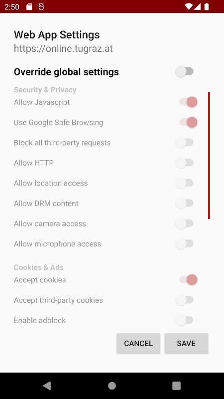 • 많은 설정(JavaScript, 쿠키, 광고 차단, 위치 액세스 등)을 모든 웹 앱에 대해 개별적으로 설정할 수 있습니다.