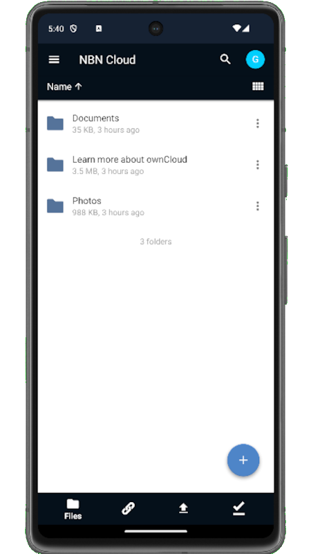 Android용 NBN Cloud 앱을 사용하면 동기화된 모든 NBN Cloud 파일을 탐색하고, 새 파일을 생성 및 편집하고, 해당 파일과 폴더를 동료와 공유하고, 해당 폴더의 내용을 모든 장치에서 동기화된 상태로 유지할 수 있습니다. 서버의 디렉터리에 파일을 복사하기만 하면 나머지는 NBN Cloud가 알아서 처리합니다.