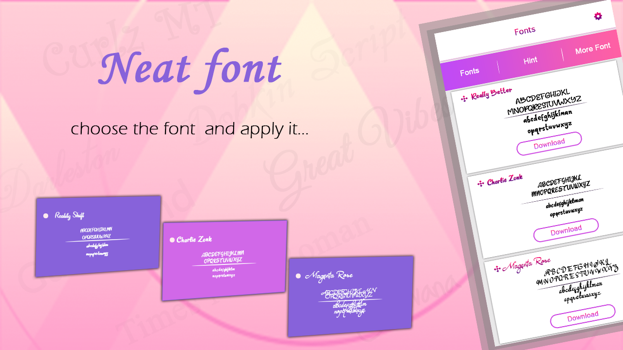Use our smart Neat Font Free Style application which is allows users to get one or more Font Style in your mobile for free. Application which allows users to see instant preview about fonts and then apply on device. Quick settings to change your font directly fast within some seconds. Get Neat Fonts with Large collection and best way to change the stylish look to Android Phone with attractive Fonts.
