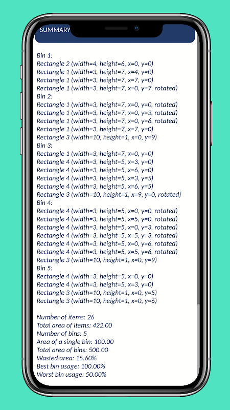 이 앱은 판금 절단 최적화는 물론, 컨테이너 채우기 및 중량 제한이 있는 트럭 적재 등 다양한 산업 분야에 사용할 수 있는 빈 포장 시뮬레이터입니다. 기술적으로 빈 포장 문제에 대한 더 나은 해결책을 기대한다면, 인스턴스 수가 증가할수록 계산 시간이 급격히 증가합니다. 목표는 모든 품목을 담을 수 있는 가장 적은 빈을 찾는 것입니다.
