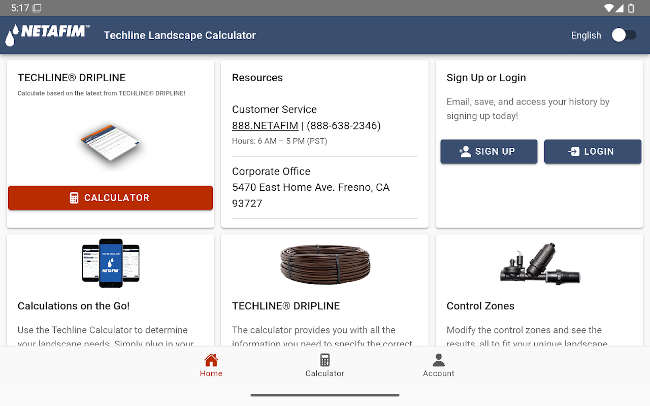 Netafim Techline 계산기는 조경 설계, 프로젝트 공급 및 계산을 결정하기 위한 지침을 제공합니다. 여기에는 토양, 식물, 물받이 배치, 관개 면적, 압력, 유속 및 방출기 간격에 대한 변수가 포함됩니다.