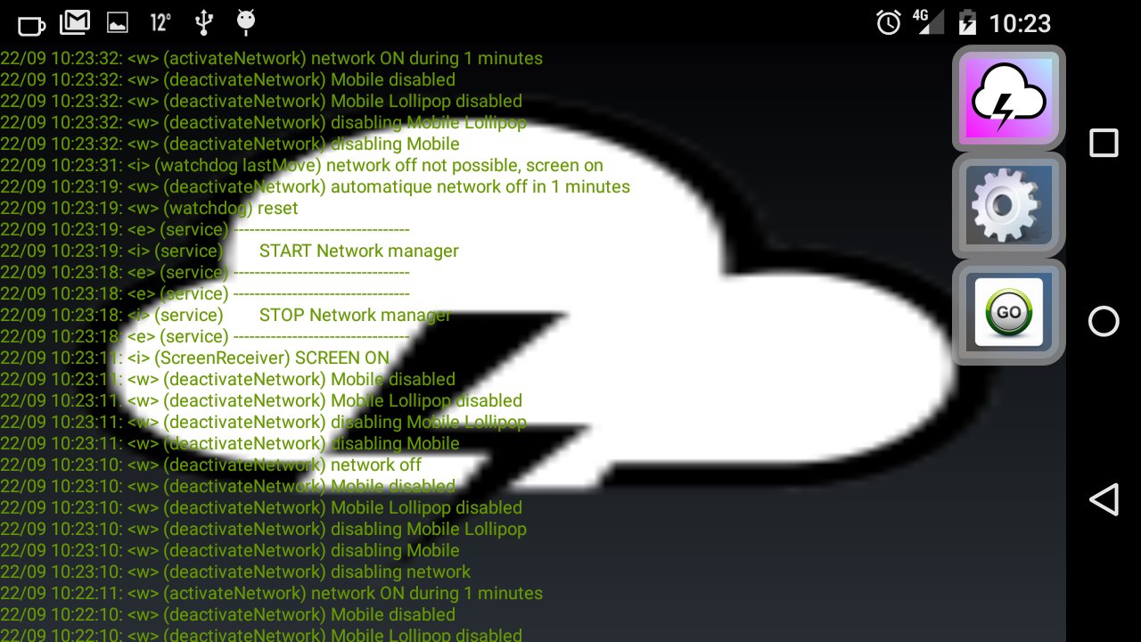 Cette application n'active pas le réseau au déverrouillage de l'appareil (paramétrable). Une action de l'utilisateur est requise pour activer (via un widget). Une fois l'activation manuelle effectuée, la coupure du réseau se fera lors de l'extinction de l'écran et après un temps configurable.