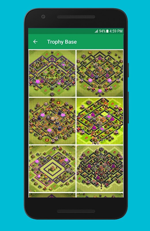 It contains Maps from Town Hall 8 with three category War, Trophy and Hybrid.
