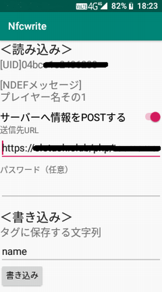 NFC 태그에 문자열을 쓰거나 그것을로드하고 표시 할 수 있습니다. 또한로드시에 그 내용을 임의의 URL에 HTTP POST하는 것도 가능합니다.