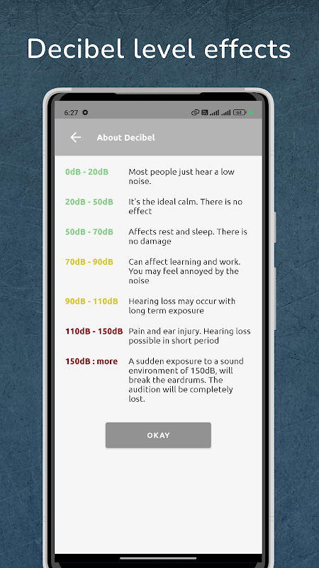 이 앱은 보조 도구로 사용됩니다. 휴대폰 마이크는 일반적으로 사람의 음성 주파수에 맞춰 보정되므로 dB 정확도에 영향을 미칠 수 있습니다. 전문적인 결과를 얻으려면 인증된 소음 측정기를 사용하는 것이 좋습니다.