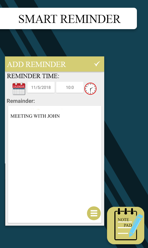 Notepad a new, comfortable and simple notepad right on your Android. Notepad is always at your hand, you just have to write down what you want to do or what you don't want to forget, you may even do not save it, it would do it for you.