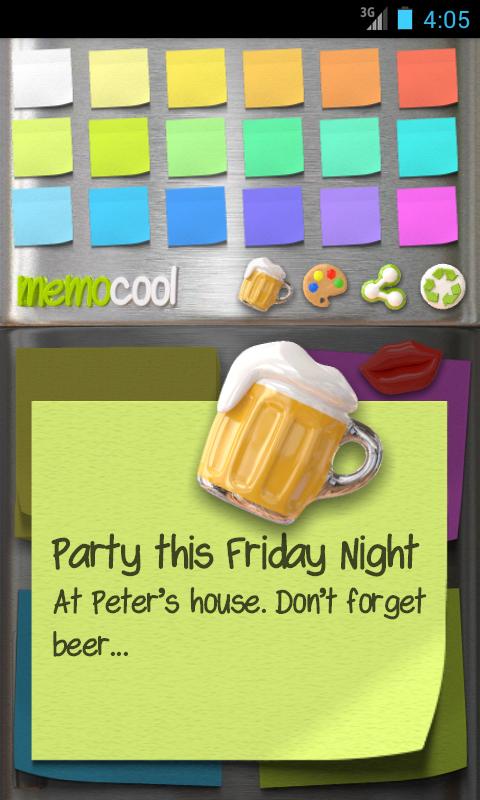MemoCool는 빠른 메모를 만들기 위해 사용하고 추가 색상과 재미있는 자석과 같은 아이콘으로 그들을 개인화 할 수있는 간단하고 실용적인 응용 프로그램입니다. MemoCool은 당신의 집에있는 냉장고에 자석으로 붙어 일반적인 메모를 에뮬레이트,하지만 지금은 당신이 당신의 주머니에 당신과 함께 그것을 수행 할 수있는 장점이있다. 생성, 편집, 보관 또는 제한없이 노트를 여러 번 삭제할 수 있습니다.