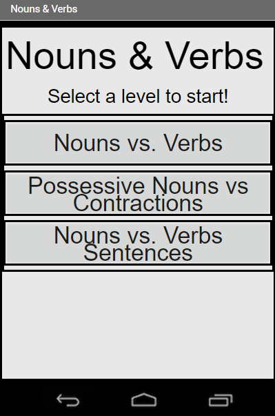 이 게임에서는 다양한 어려움을 겪고있는 여러 단계 중 하나를 선택하여 품사를 배우고 재미있게 배울 수 있습니다! 단어가 화면 상단에 나타나면 주어진 단어가 명사인지 동사인지 또는 소유 명사 또는 수축을 선택한 수준에 따라 선택해야합니다. 30 가지가 넘는 단어 목록에서 무작위로 단어를 선택하여 재미있게 보행하면서 단어를 확장 할 수 있습니다! 당신이 가진 시간에 질문을 바로받을 수있는만큼 점수를 얻으십시오! 수업 시간에 최고의 어휘력을 얻을 때까지 연습하십시오!