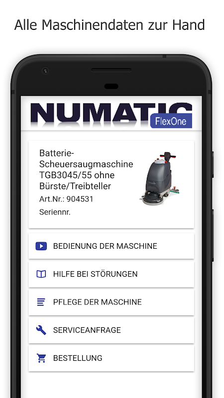 QR 코드를 당하거나 빨리 NFC 칩 인식에 의해 모든 머신 데이터 Numatic FlexOne에서 호출된다