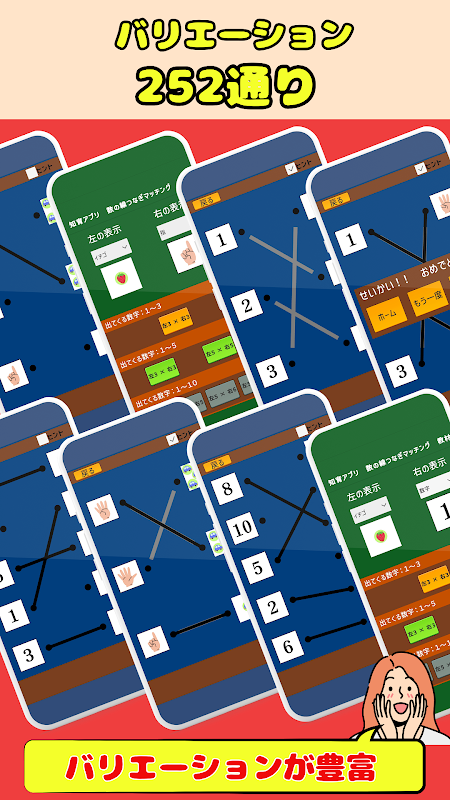 앱의 학습 방법에는 동일한 숫자를 나타내는 두 항목 사이를 선으로 연결하는 것이 포함됩니다. 딸기나 자동차 같은 구체적인 물체, 숫자, 손가락 번호, 히라가나와 한자로 된 숫자 등 6가지 유형의 요소 중에서 선택할 수 있습니다. 이 접근 방식은 시각적 일치와 수치 이해에 도움이 되므로 어린 학습자에게 숫자를 가르치는 효과적인 도구가 됩니다.