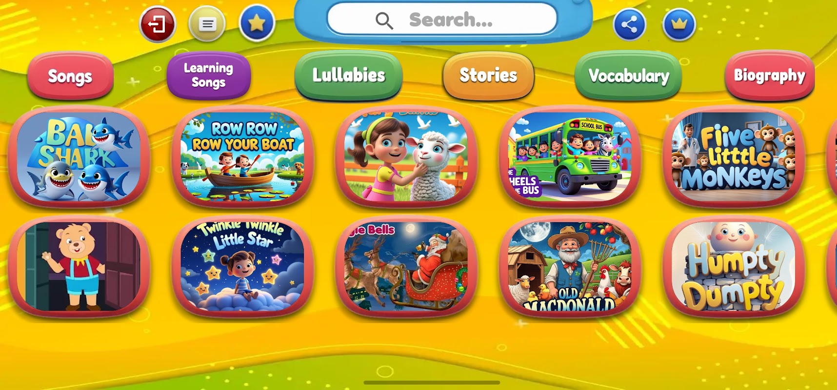 동요, 학습 노래, 자장가, 이야기, 어휘 학습 및 전기로 가득한 재미있고 교육적인 앱입니다. 유아 및 미취학 아동에게 적합합니다.