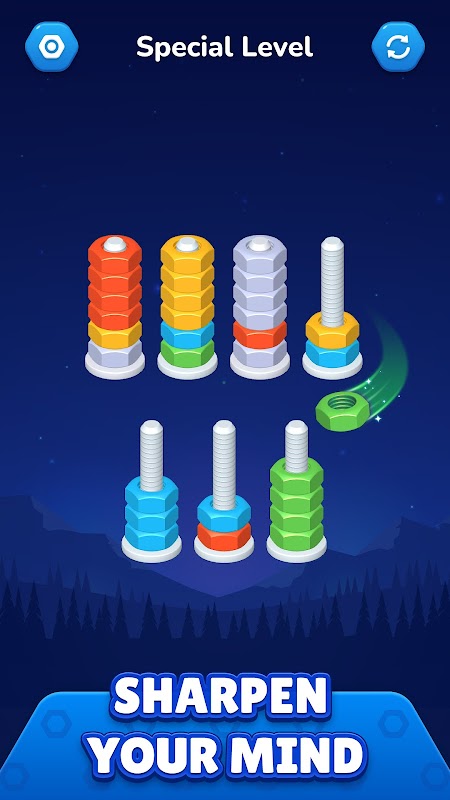 생기 넘치는 견과류를 볼트에 정리하고 색상 정렬 퍼즐을 하나씩 마스터하면서 두뇌에 도전하고 몇 시간 동안 즐거운 시간을 보내세요.