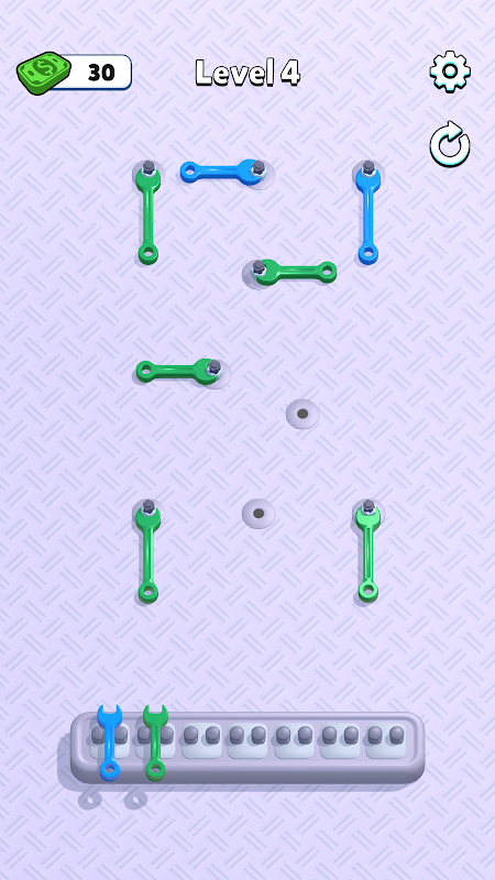 거대한 나사가 성공의 열쇠를 쥐고 있습니다. 너트를 탭하여 나사 주위를 우아하게 회전시키는 것이 여러분의 임무입니다. 목표는 명확합니다. 그리드에서 같은 색상의 너트 3개를 매치하여 해당 영역을 지우고 포인트를 획득하는 것입니다.