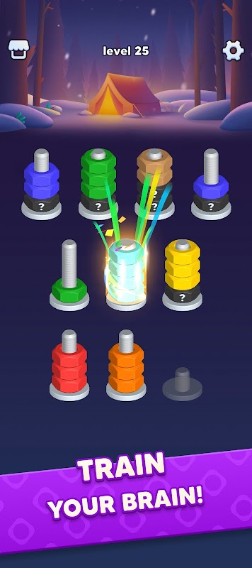 동일한 색상의 너트만 쌓을 수 있으며 대상 볼트에 충분한 공간이 있어야 한다는 점을 기억하십시오. 진행하면서 정렬 퍼즐이 더욱 어려워지고 전략과 빠른 사고를 테스트합니다.