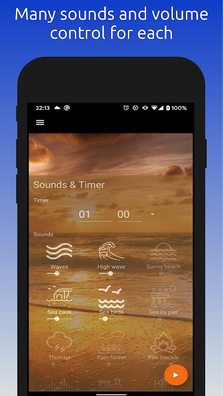 부드러운 파도 소리가 당신을 잠들게합니다. 이 앱을 사용하면 다양한 파도 소리와 해변 소리뿐만 아니라 불 딱딱 소리, 천둥, 기차 및 도시와 같은 다른 유형의 편안한 소리 중에서 선택할 수 있습니다.