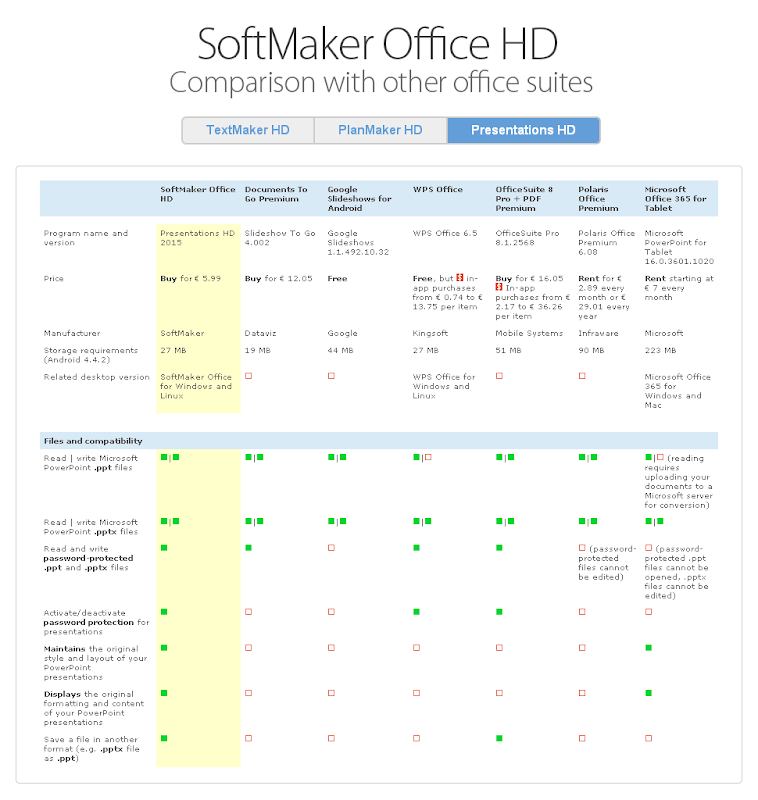 직관적인 사용 방법: SoftMaker Presentations나 Microsoft PowerPoint을 사용해 본 적이 있는 경우, Presentations HD 또한 손쉽게 사용이 가능합니다. 사용자 인터페이스는 PC와 유사하며, 터치스크린 사용에 더욱 알맞게 설정되어 있습니다.