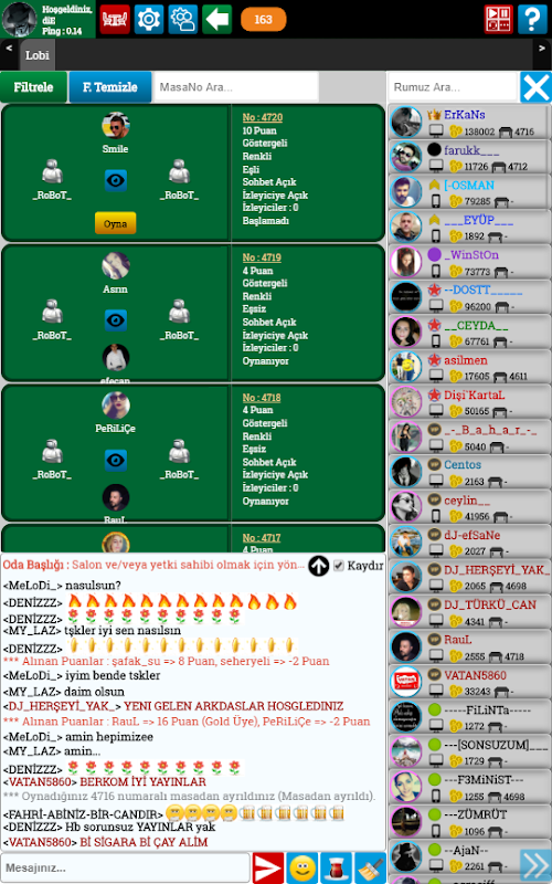 사용자가 Okeyynet에 로그인 할 수있는 다양한 방법이 추가되었습니다. 미개봉 상태에는 세 가지 옵션이 있습니다. 회원 로그인, 손님 로그인 및 페이스 북 로그인이 가능합니다. 멤버십이없는 사용자는 동일한 페이지에서 응용 프로그램의 멤버가되어 게임의 즐거움을 시작할 수 있습니다. 회원 로그인에 사용 된 닉, 비밀번호 및 보안 코드를 작성한 후 로그인 버튼을 클릭하십시오. 나중에 프로세스를 반복하지 않으려는 사용자에 대해서는 Remember me 확인란을 선택하는 것이 좋습니다. 따라서 응용 프로그램을 누르면 계정을 즉시 입력 할 수 있습니다. 게스트 입장의 경우 성별 및 보안 코드를 입력해야합니다. 소셜 미디어 항목이 계정에 직접 연결되어 있으므로 추가 정보가 필요하지 않습니다.
