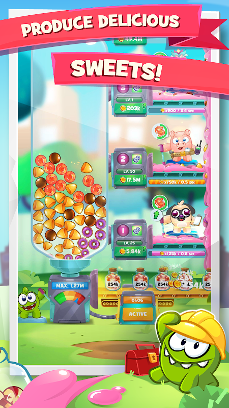 Om Nom is here and needs your help building the biggest Candy Factory of the world!