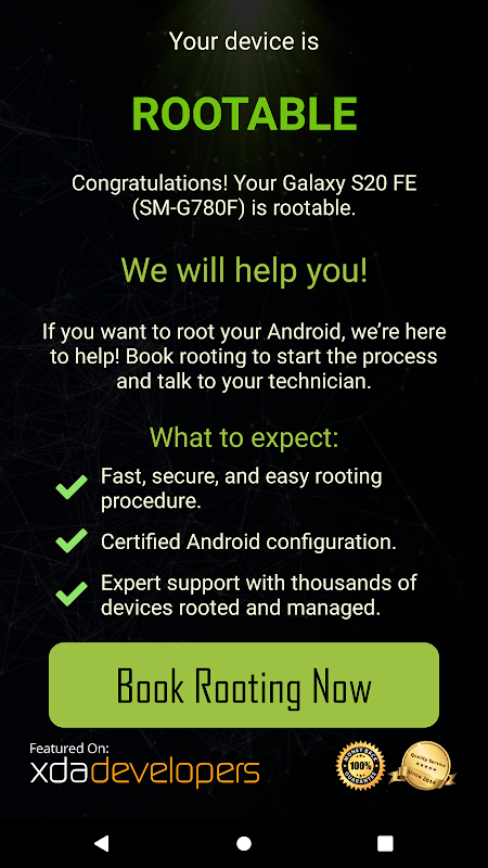 운이 좋으면 Android가 루팅 가능하다는 사실을 알게 된 경우 '지금 루팅 예약' 버튼을 클릭하여 전문가와 루팅 세션을 예약할 수 있습니다.