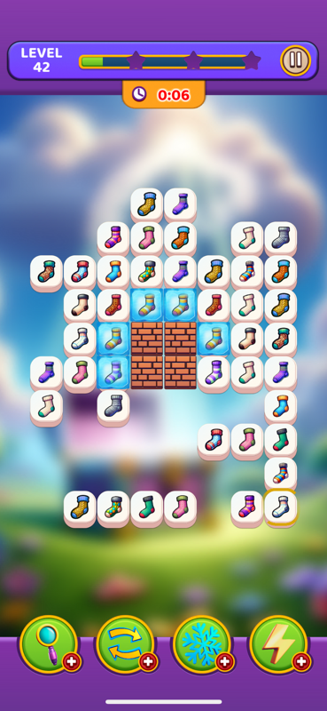 - HINT 버튼을 사용하여 연결 가능한 쌍을 확인하세요. 타일을 재정렬하려면 SHUFFLE 버튼을 사용하세요. FREEZE TIME 버튼을 사용하여 카운트다운을 중지하고 LIGHTNING 버튼을 사용하여 보드에서 짝을 이루는 2개의 매치를 제거합니다.