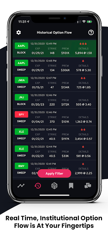 OptionsFlow는 심층적인 시장 데이터가 포함된 고급 옵션 활동 모니터 및 스캐너를 제공합니다. OptionsFlow는 전문가처럼 옵션을 거래하는 데 도움이 되는 모바일 앱 중 하나입니다. OptionsFlow로 시장 데이터를 현명하게 살펴보고, 잘 계획하고, 스마트하게 거래하세요.