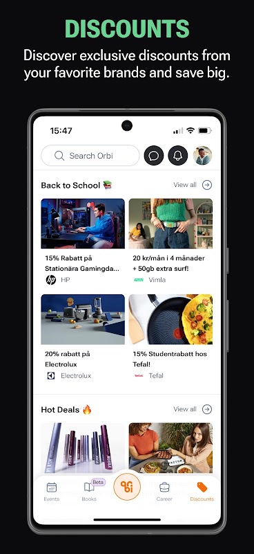 학생 생활을 추적하는 스트레스에서 벗어나십시오. Orbi는 모든 것을 한곳에 수집합니다! 할인을 확인하고, 교재를 구매 및 판매하고, 취업 기회를 탐색하고, 최고의 이벤트 티켓을 예약하세요.